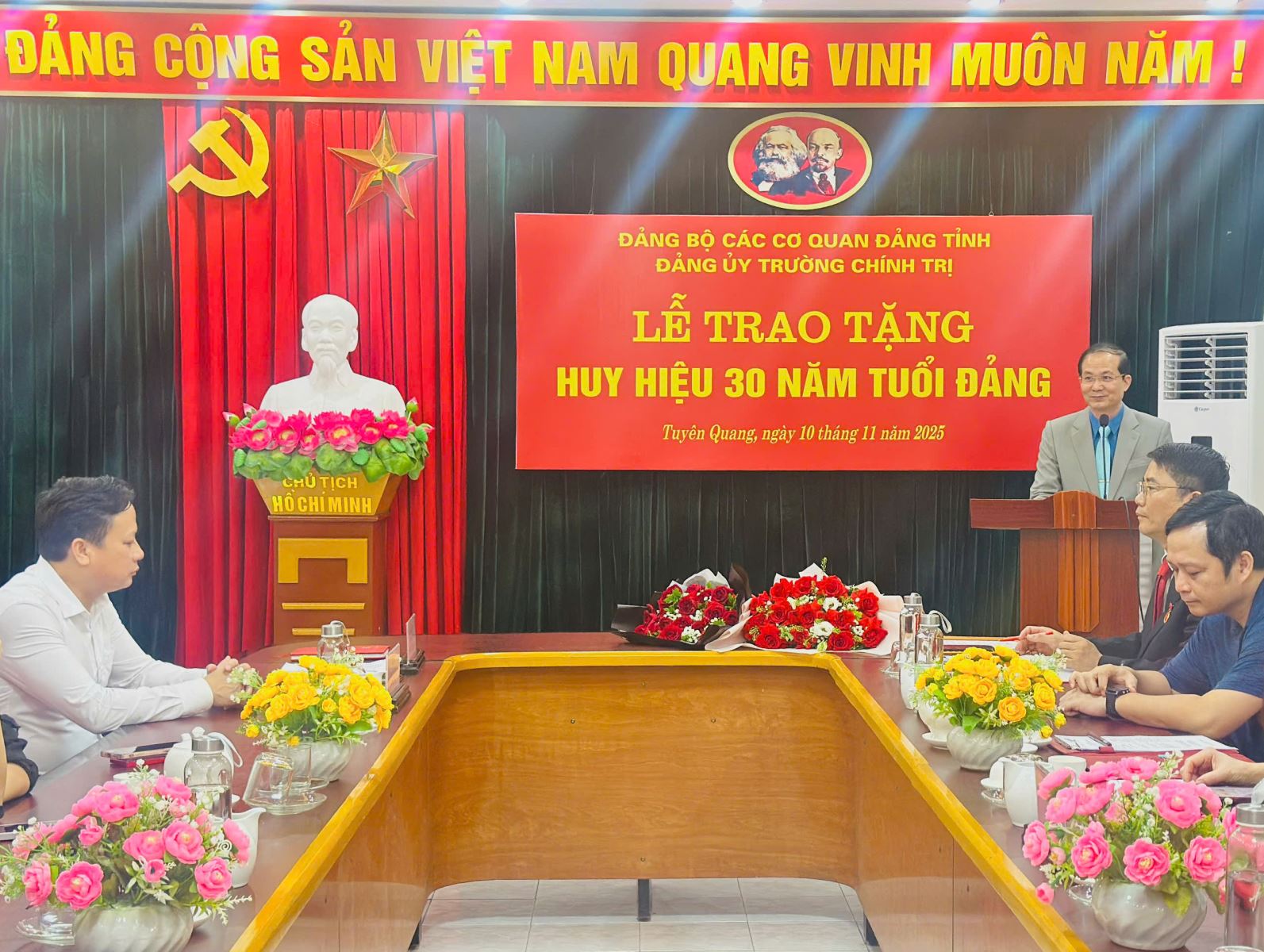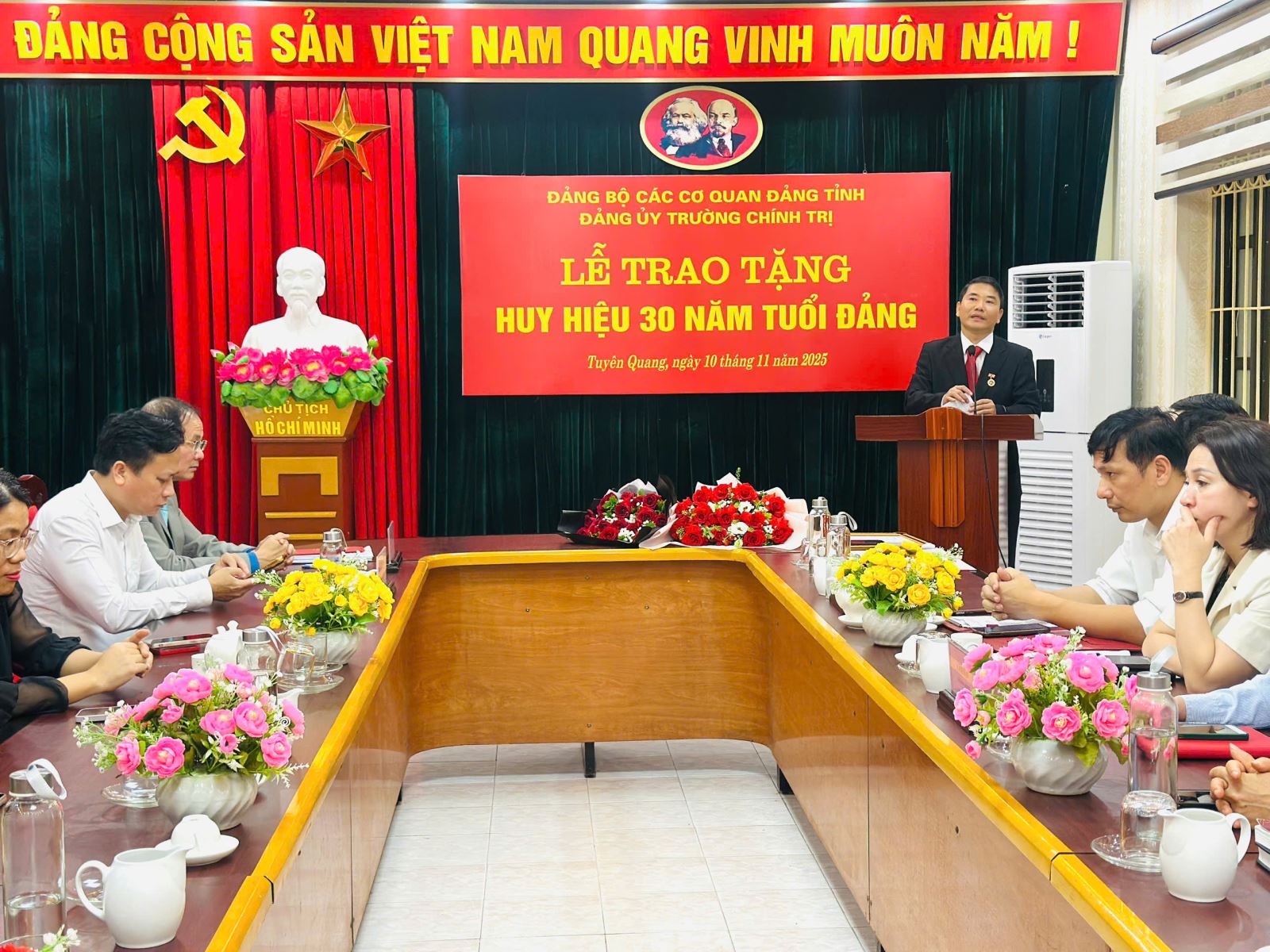 Chiều ngày 10/11/2025, Đảng uỷ Trường Chính trị tỉnh Tuyên Quang tổ chức Lễ trao tặng Huy hiệu 30 năm tuổi Đảng cho đồng chí Nguyễn Văn Hòa, Ủy viên Ủy ban kiểm tra Đảng ủy, Phó Bí thư Chi bộ, Phó Trưởng khoa Lý luận cơ sở. Dự Hội nghị có đồng chí Phạm Sỹ Hùng, Ủy viên BCH Đảng bộ Các cơ quan Đảng tỉnh, Bí thư Đảng ủy, Hiệu trưởng Trường Chính trị tỉnh; các đồng chí ủy viên Ban Chấp hành Đảng bộ, lãnh đạo Trường, trưởng, phó các khoa, phòng và đảng viên Chi bộ khoa Lý luận cơ sở.