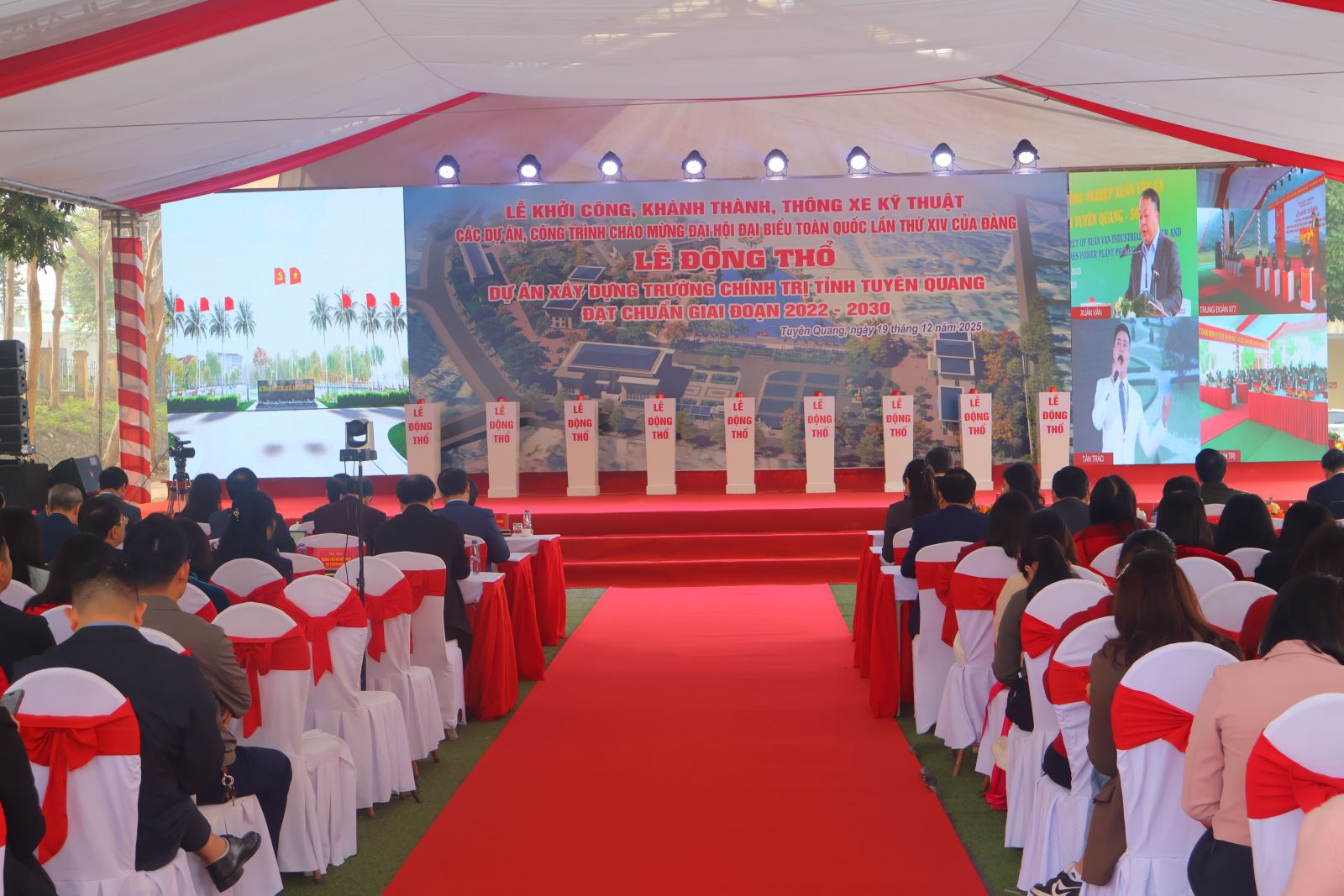 Trong không khí cả nước đang đẩy mạnh các phong trào thi đua yêu nước, lập thành tích chào mừng Đại hội đại biểu toàn quốc lần thứ XIV của Đảng, hòa chung niềm vui của sự kiện Lễ khởi công, khánh thành, thông xe kỹ thuật với 246 công trình, dự án trên toàn quốc, cùng với 79 điểm cầu trên cả nước, sáng ngày 19/12/2025, tại Trường Chính trị tỉnh, UBND tỉnh Tuyên Quang long trọng tổ chức Lễ Động thổ Dự án Xây dựng Trường Chính trị tỉnh Tuyên Quang đạt chuẩn, giai đoạn 2022-2025 trực tiếp kết hợp trực tuyến với các điểm cầu trong tỉnh và Trung ương.