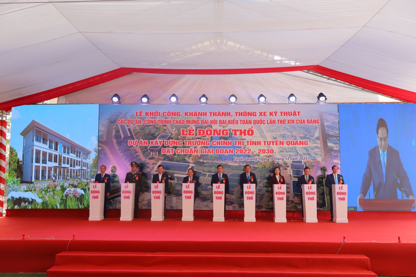 Tại buổi Lễ các đại biểu đã nghe báo cáo từ các điểm cầu trung tâm của tỉnh, Trung ương và thực hiện Nghi thức Bấm nút khởi công dự án Xây dựng Trường Chính trị tỉnh Tuyên Quang đạt chuẩn, giai đoạn 2022-2025
