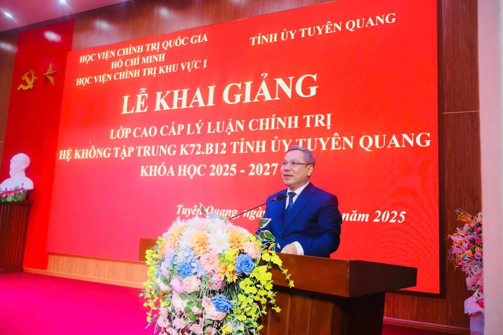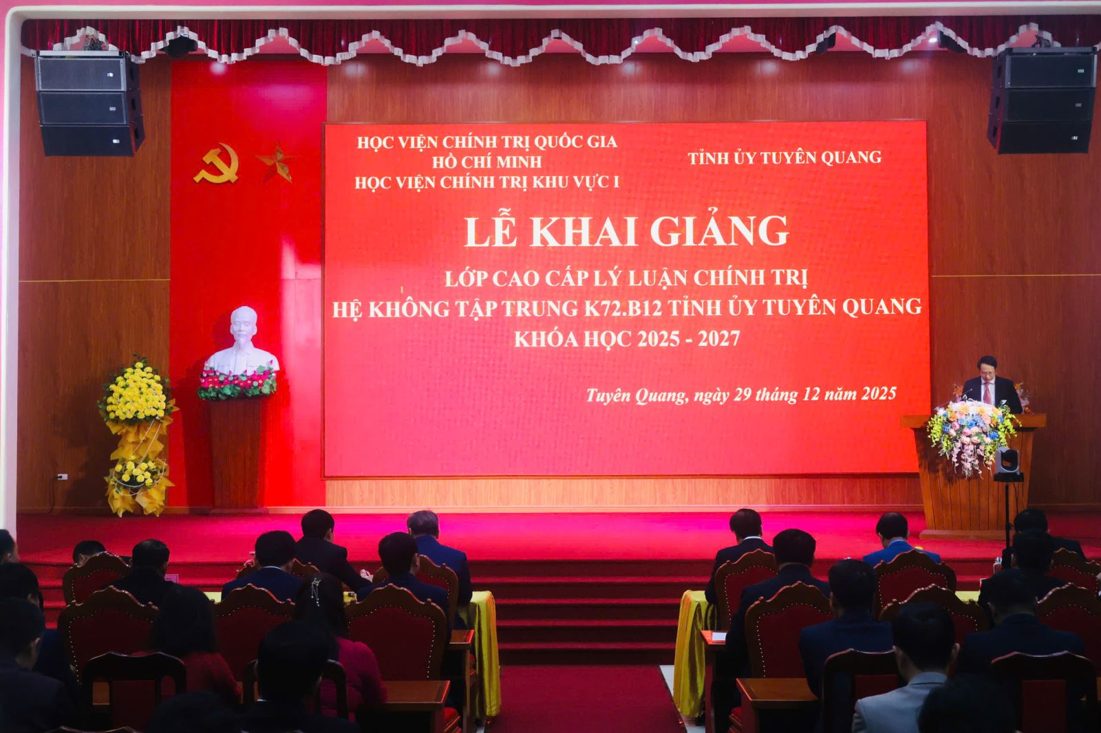 Thực hiện Quyết định số 1471- QĐ/HVCTKV I, ngày 23/12/2025 của Giám đốc Học viện chính trị khu vực I về việc mở lớp cao cấp lý luận chính trị hệ không tập trung tại tỉnh Tuyên Quang, sáng ngày 29/12/2025, Học viện Chính trị khu vực I phối hợp với Tỉnh ủy Tuyên Quang tổ chức Lễ khai giảng lớp Cao cấp lý luận chính trị hệ không tập trung K72.B12 Tỉnh ủy Tuyên Quang (khóa học 2025 - 2027).