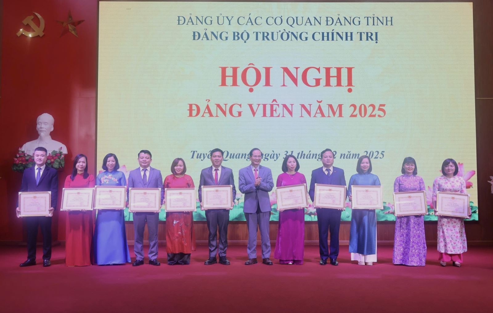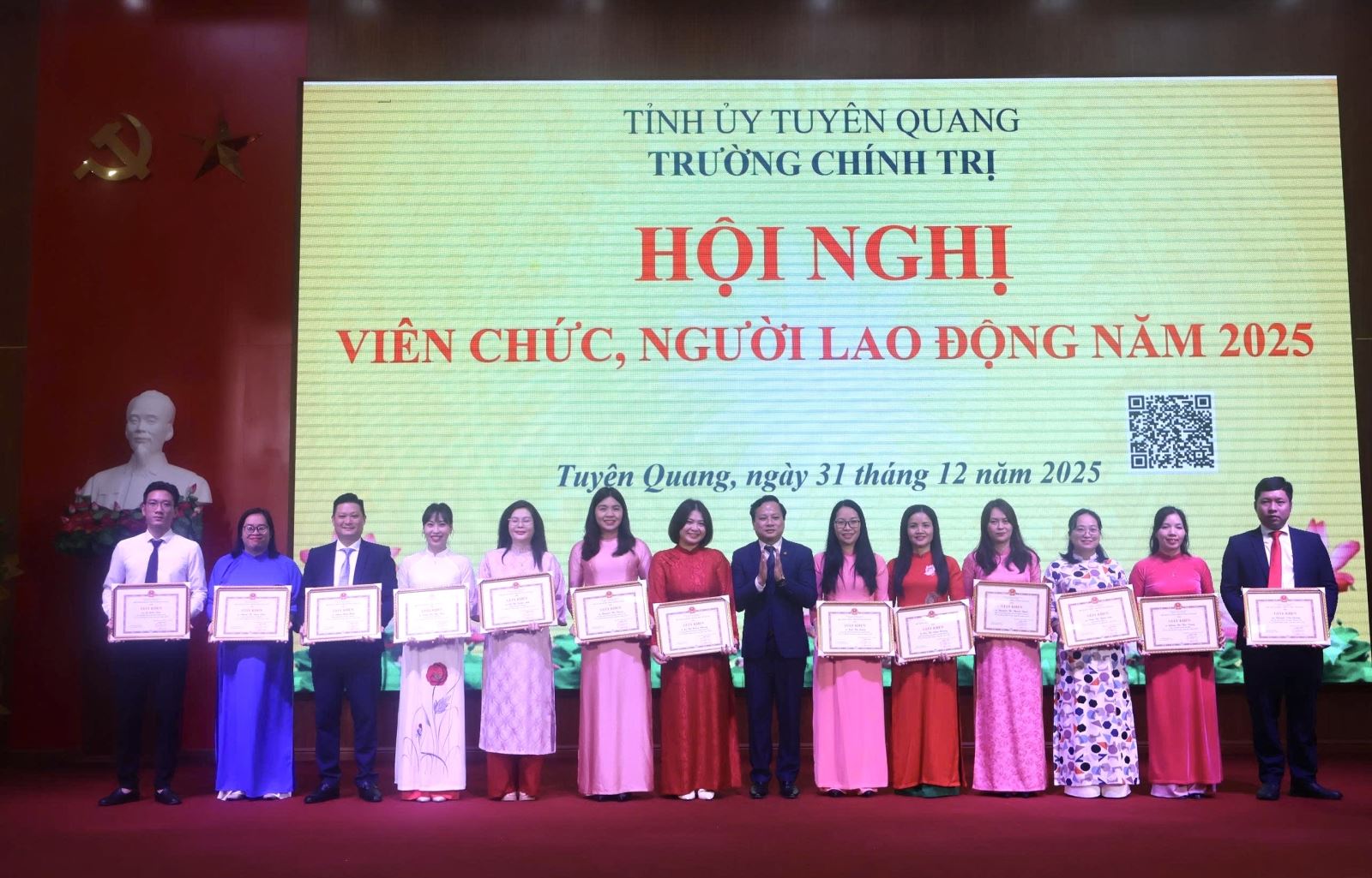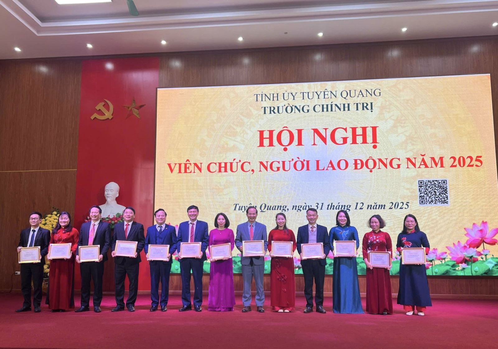 Kết quả công tác thi đua, khen thưởng năm 2025: Tập thể Trường được Giám đốc Học viện Chính trị quốc gia Hồ Chí Minh tặng Bằng khen đã có thành tích xuất sắc trong phong trào thi đua Cụm thi đua các trường chính trị tỉnh, thành phố trực thuộc Trung ương năm 2025; được Ban Chỉ đạo 35 của Tỉnh ủy Tuyên Quang tặng Giấy chứng nhận “Tập thể xuất sắc” trong công tác Bảo vệ nền tảng tư tưởng của Đảng năm 2025; đề nghị Chủ tịch UBND tỉnh tặng danh hiệu “Tập thể lao động xuất sắc” cho phòng Quản lý đào tạo và nghiên cứu khoa học; Đảng ủy nhà trường tặng Giấy khen cho 01 chi bộ Hoàn thành xuất sắc nhiệm vụ, 12 đảng viên hoàn thành xuất sắc nhiệm vụ năm 2025 và 13 đảng viên có thành tích xuất sắc công tác Bảo vệ nền tảng tư tưởng của Đảng năm 2025; Hiệu trưởng nhà trường tặng danh hiệu “Tập thể lao động tiên tiến” cho 04 đơn vị khoa, phòng; 53 cá nhân đạt danh hiệu “Lao động tiên tiến”; 14 đồng chí được tặng danh hiệu “Chiến sĩ thi đua cơ sở”; 16 đồng chí được Hiệu trưởng tặng Giấy khen vì có thành tích trong công tác.