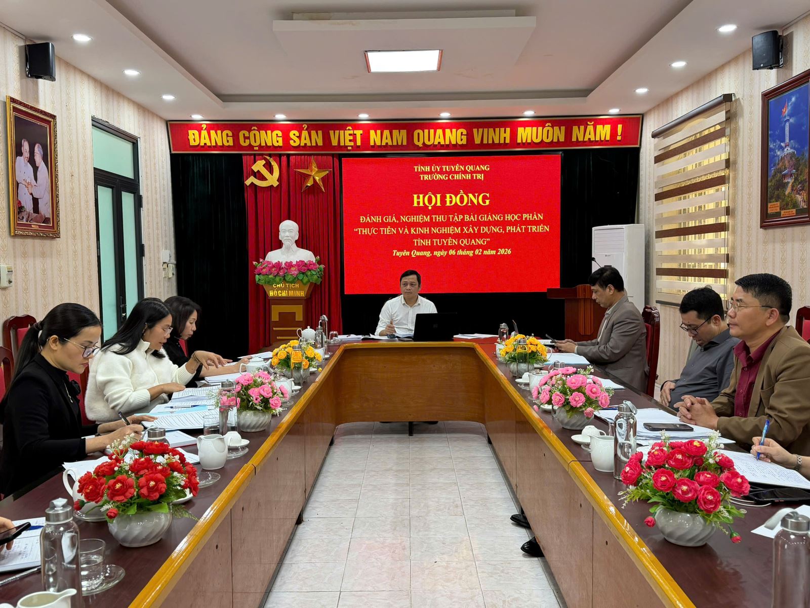 Thực hiện Hướng dẫn số 791-KH/TCT, ngày 21/8/2025 của Học viện Chính trị quốc gia Hồ Chí Minh về biên soạn Tập bài giảng học phần “Thực tiễn và kinh nghiệm xây dựng, phát triển địa phương” thuộc chương trình Trung cấp lý luận chính trị; chiều ngày 06/02/2026, Trường Chính trị tỉnh Tuyên Quang tổ chức Hội nghị đánh giá, nghiệm thu tập bài giảng học phần “Thực tiễn và kinh nghiệm xây dựng, phát triển tỉnh Tuyên Quang” thuộc chương trình Trung cấp lý luận chính trị.