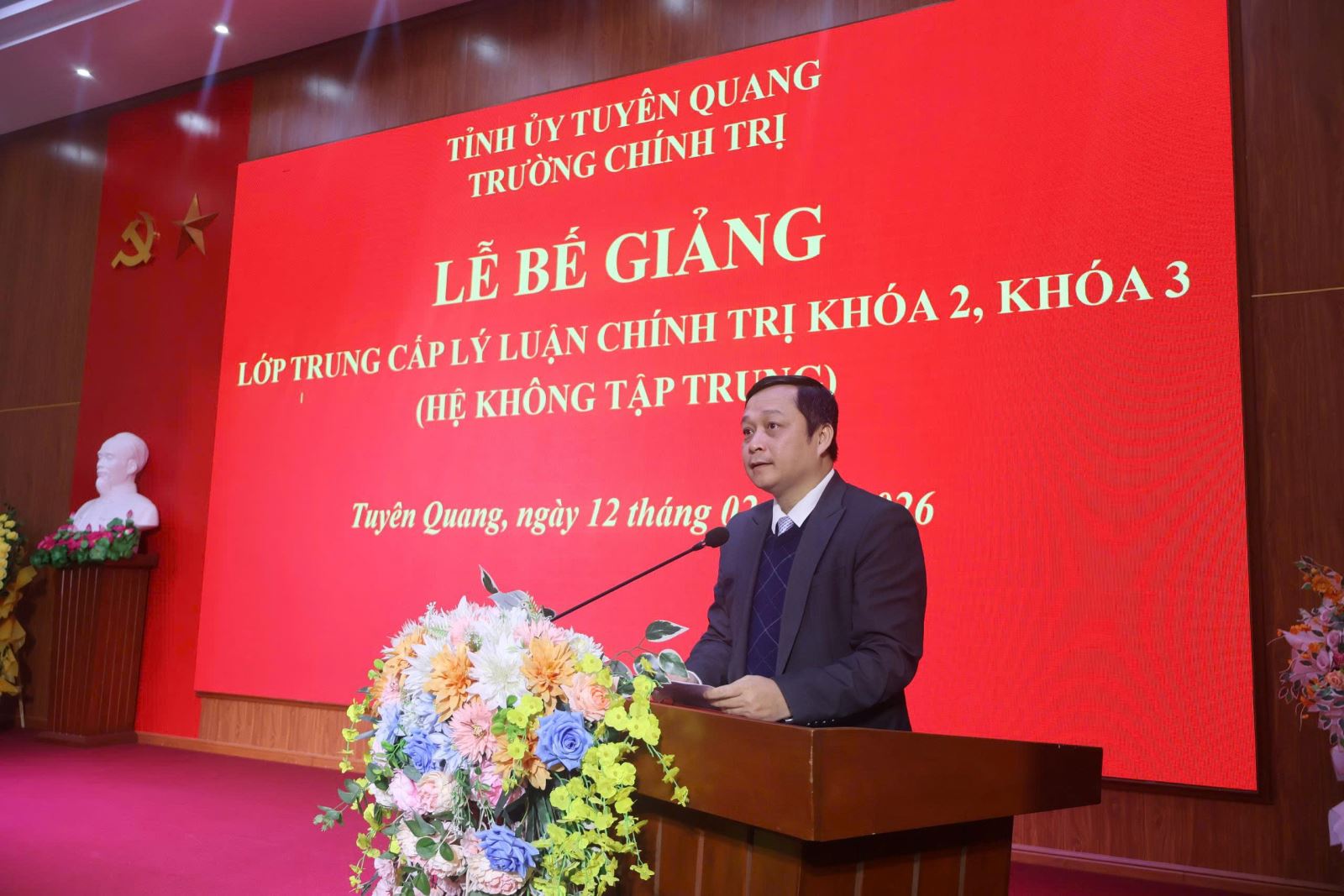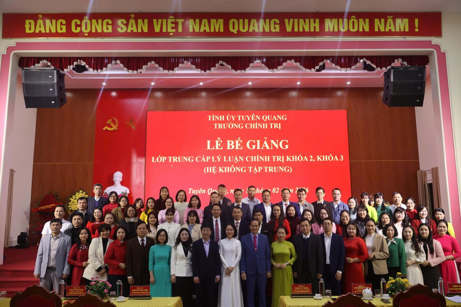 Sáng ngày 12/02/2026, Trường Chính trị tỉnh Tuyên Quang tổ chức Lễ bế giảng các lớp Trung cấp lý luận chính trị (LLCT) K2, K3 ( hệ không tập trung) năm 2025. Dự lễ bế giảng về phía Ban Tổ chức Tỉnh ủy có đồng chí Nguyễn Văn Hiền, Phó Trưởng ban Tổ chức Tỉnh ủy; về phía Trường Chính trị tỉnh có đồng chí Phạm Sỹ Hùng, Ủy viên BCH Đảng bộ các Cơ quan Đảng tỉnh, Bí thư Đảng ủy, Hiệu trưởng Trường Chính trị tỉnh, các đồng chí lãnh đạo nhà trường, lãnh đạo các khoa, phòng; các thầy giáo, cô giáo Trường Chính trị tỉnh và 113 học viên các lớp Trung cấp lý luận chính trị K2, K3 (hệ không tập trung) năm 2025.
