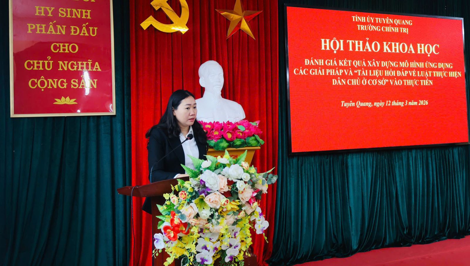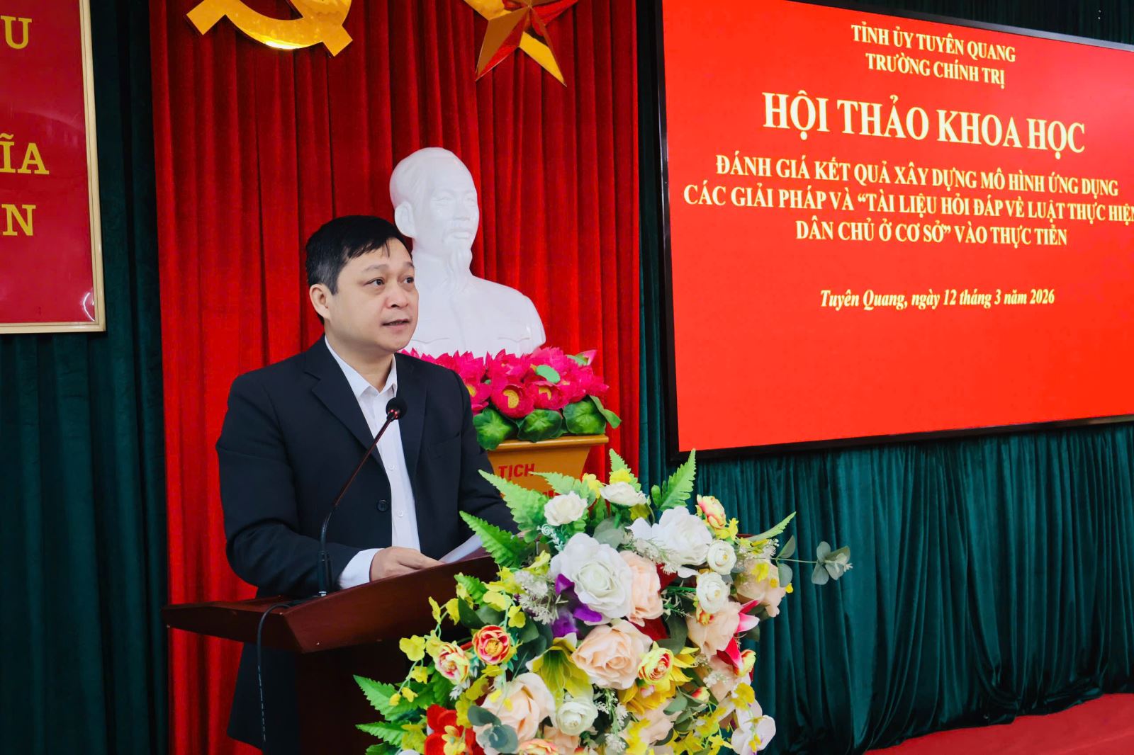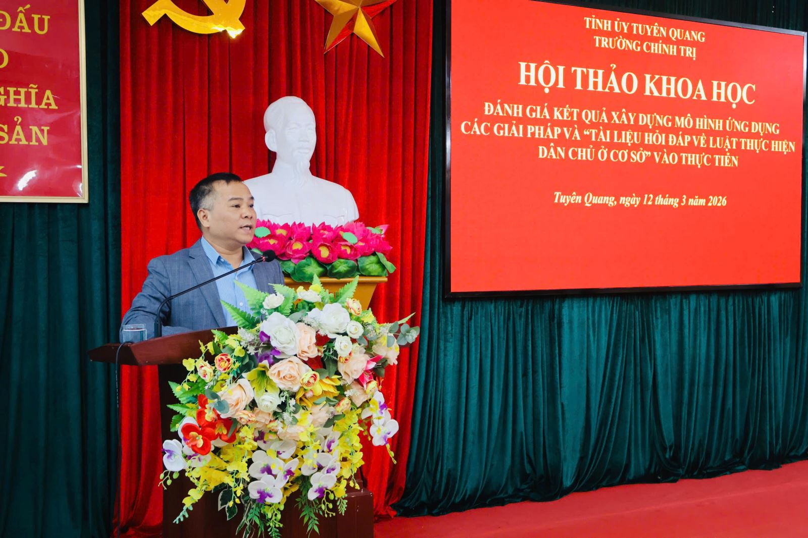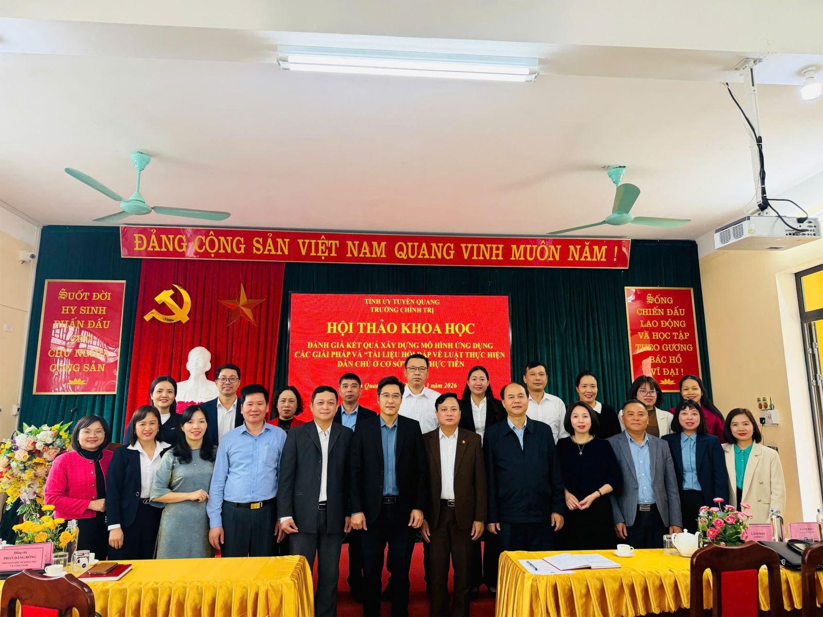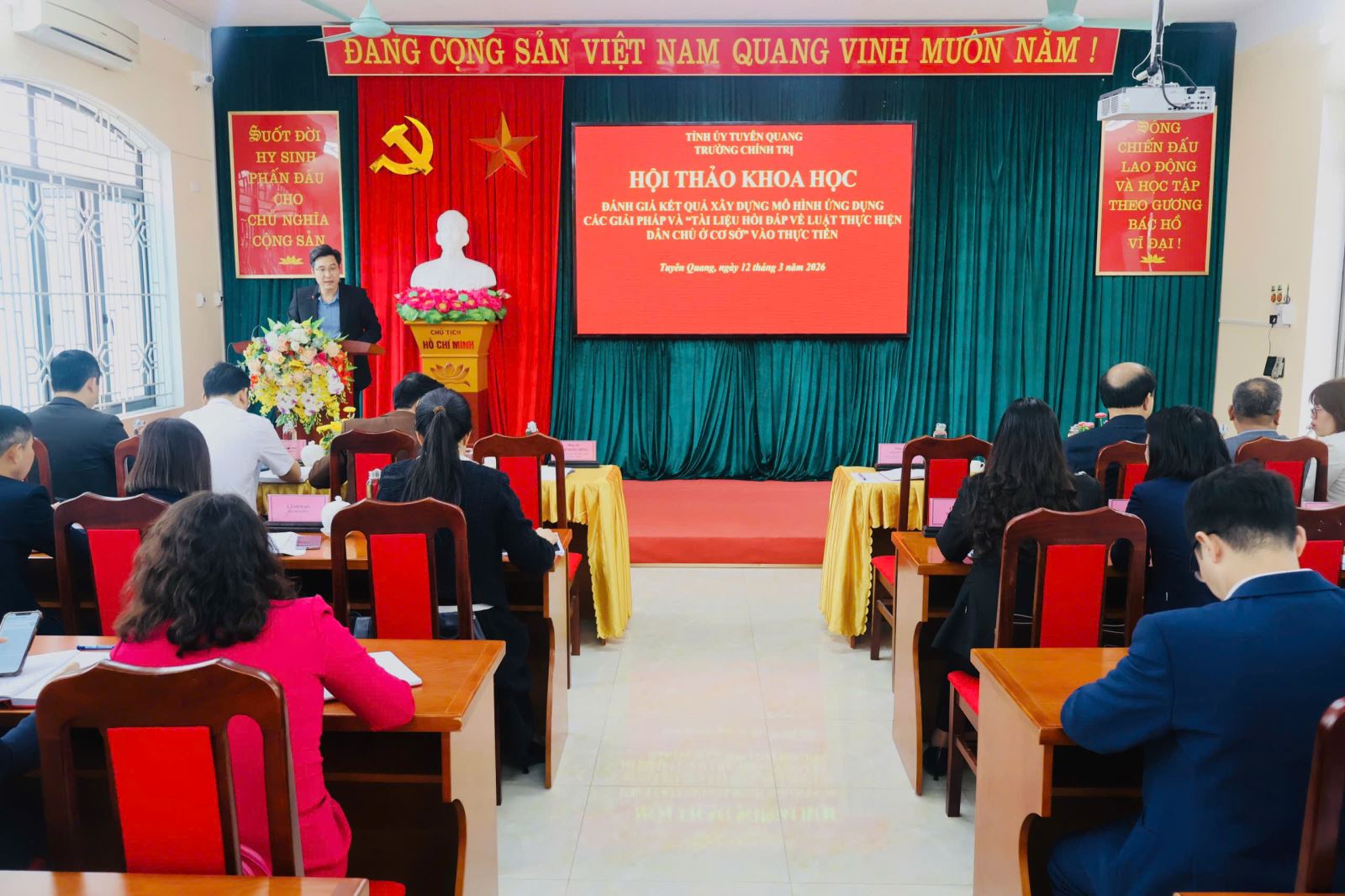 Thực hiện Quyết định số 990/QĐ-UBND ngày 14/8/2024 của Chủ tịch UBND tỉnh Tuyên Quang về việc phê duyệt Đề tài “Nâng cao hiệu quả thực hiện pháp luật dân chủ tại các xã, phường, thị trấn trên địa bàn tỉnh Tuyên Quang” và Quyết định 1628/QĐ-UBND ngày 22/12/2025 về việc điều chỉnh một số nội dung các đề tài, dự án khoa học công nghệ đang triển khai thực hiện trên địa bàn tỉnh Tuyên Quang. Sáng ngày 12/3/2026, Trường Chính trị tỉnh Tuyên Quang tổ chức Hội thảo khoa học “Đánh giá kết quả xây dựng mô hình ứng dụng các giải pháp và “Tài liệu hỏi đáp về Luật Thực hiện dân chủ ở cơ sở” vào thực tiễn”.